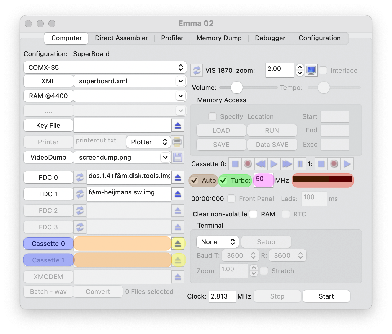 The speed of the Turbo LOAD/SAVE can be changed; default is 15 MHz (highlighted in purple), which works well on my Mac Studio (running 3.2 GHz, 20 CPU/48 GCPU, Apple M1 Ultra) as well as previous Mac pro (running a 3.5 GHz, 6-Core, Intel Xeon E5). On the Mac Studio Emma 02 still works well when using 50 MHz. For an older or slower computer, especially when having one core, consider using a lower value. Too high values will not run on slower PCs as all CPU power will be used by the emulator.