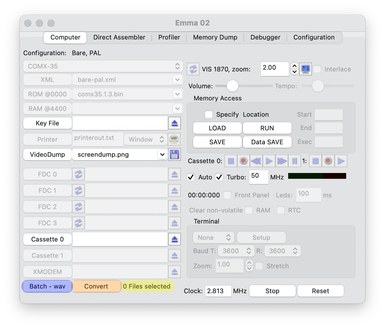 The speed of the Turbo LOAD/SAVE can be changed; default is 15 MHz (highlighted in purple), which works well on my Mac Studio (running 3.2 GHz, 20 CPU/48 GCPU, Apple M1 Ultra) as well as previous Mac pro (running a 3.5 GHz, 6-Core, Intel Xeon E5). On the Mac Studio Emma 02 still works well when using 50 MHz. For an older or slower computer, especially when having one core, consider using a lower value. Too high values will not run on slower PCs as all CPU power will be used by the emulator.