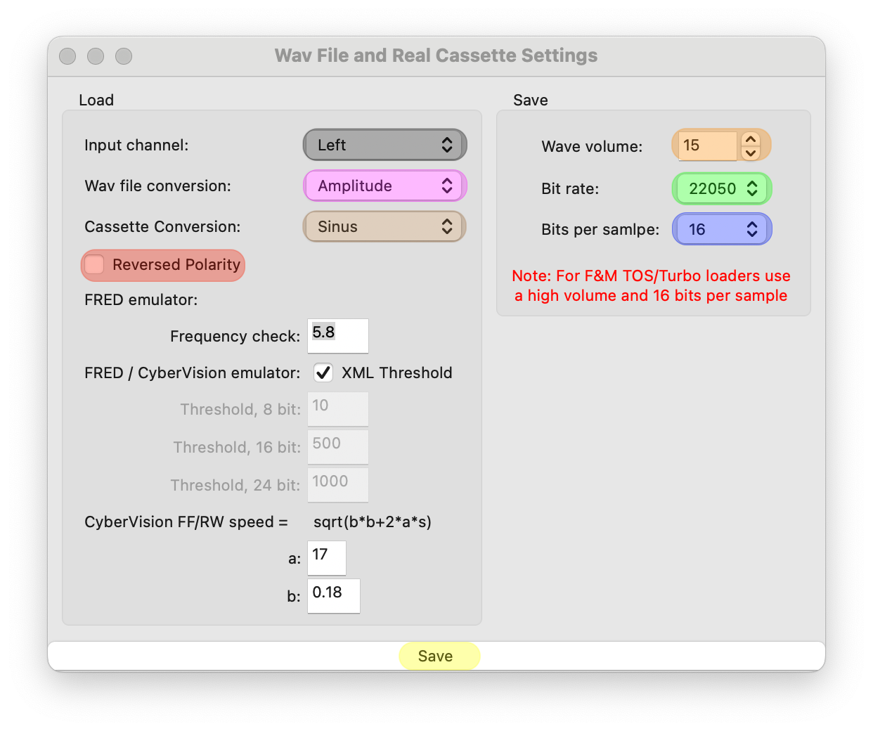 The following subsections describe applicable settings in more detail. Settings for saving to a file are the 'Wave volume' (highlighted in orange), 'Bit Rate' (highlighted in green) and 'Bits per sample' (highlighted in blue), setting for loading a wav file are the 'Wav file conversion' (highlighted in purple) and 'Reversed Polarity' (highlighted in red). The 'Cassette conversion' and 'Input Channel' are only used for Real Cassette loading and 'Threshold' and 'Frequency check' are only used for the FRED emulator.