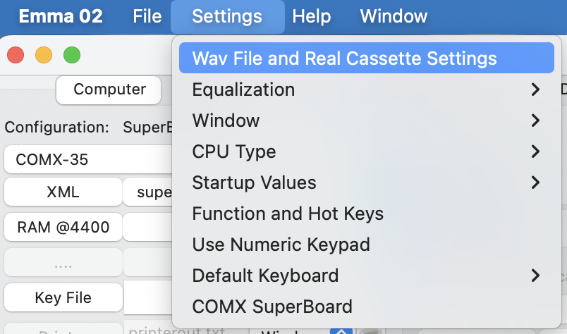 To change the Wave File settings used for loading or saving .wav files open the 'Wav File and Real Cassette Settings' via the menu below: