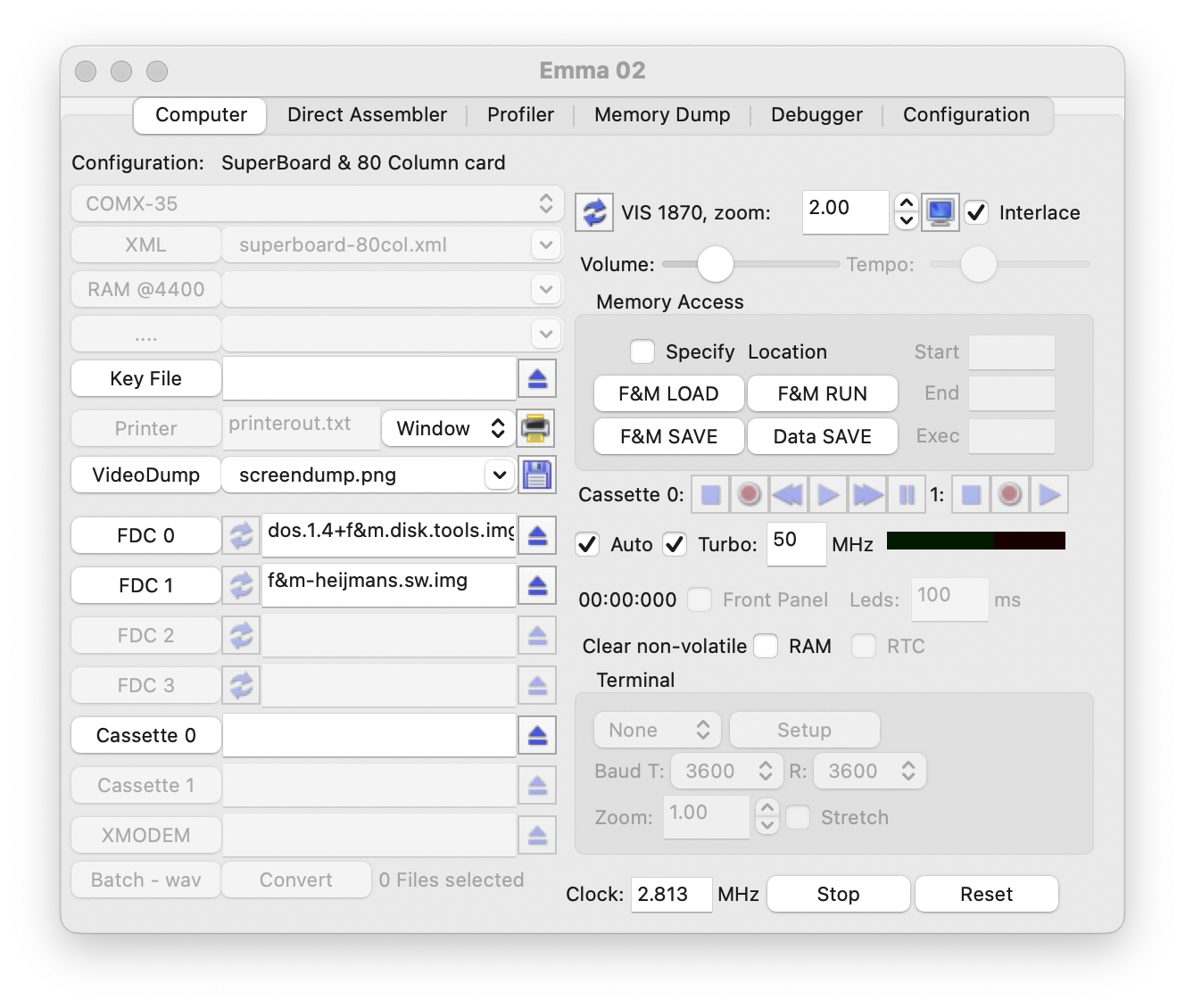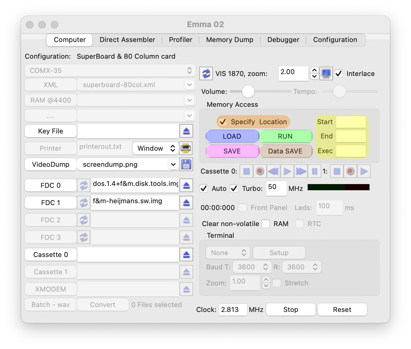 After any RUN, LOAD or SAVE command the software name will be shown in the emulator window. Note on the COMX emulator the same is done after a BASIC DOS LOAD, DOS SAVE, DOS RUN or DOS URUN command. The same name will be shown as default when using memory access features to simplify saving software to program format. When loading machine code via DOS the start and end address will be filled in as save locations, the execution address will always default to the start address.