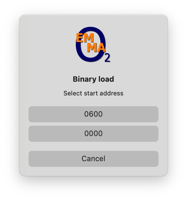 To load an intel hex or binary file into the emulator, start the emulator and use the 'LOAD' button (highlighted in blue). After this select one of the files. Note that intel hex files will be loaded at the correct (saved) memory location. Binary files will be loaded at memory location 0 unless a 'Start' address (highlighted in yellow) is specified, in that case a popup window will request the user to either load at address 0 or the specified start address: