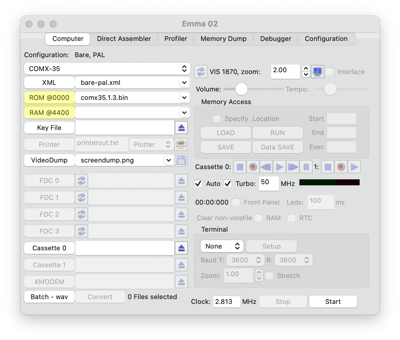 Via these buttons the emulated computer can be started with specific software loaded in ROM, RAM or NVR (Non-volatile RAM). Every button specifies the hexadecimal start address @xxxx as defied in the XML file. The default file location is also specified in the XML file. To change the location use the button to browse for the file, do the same to change the filename or type in a new file name in the text field.