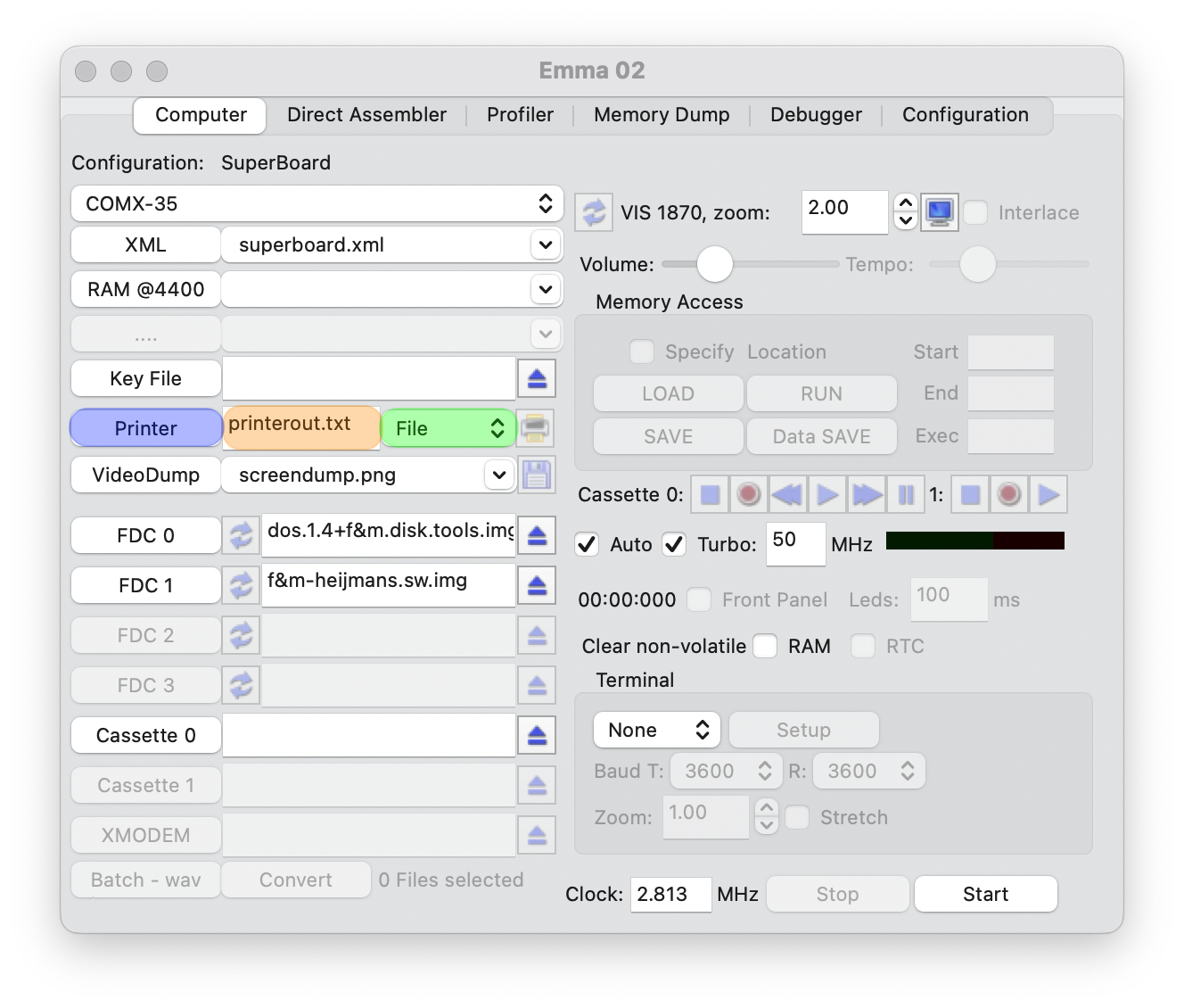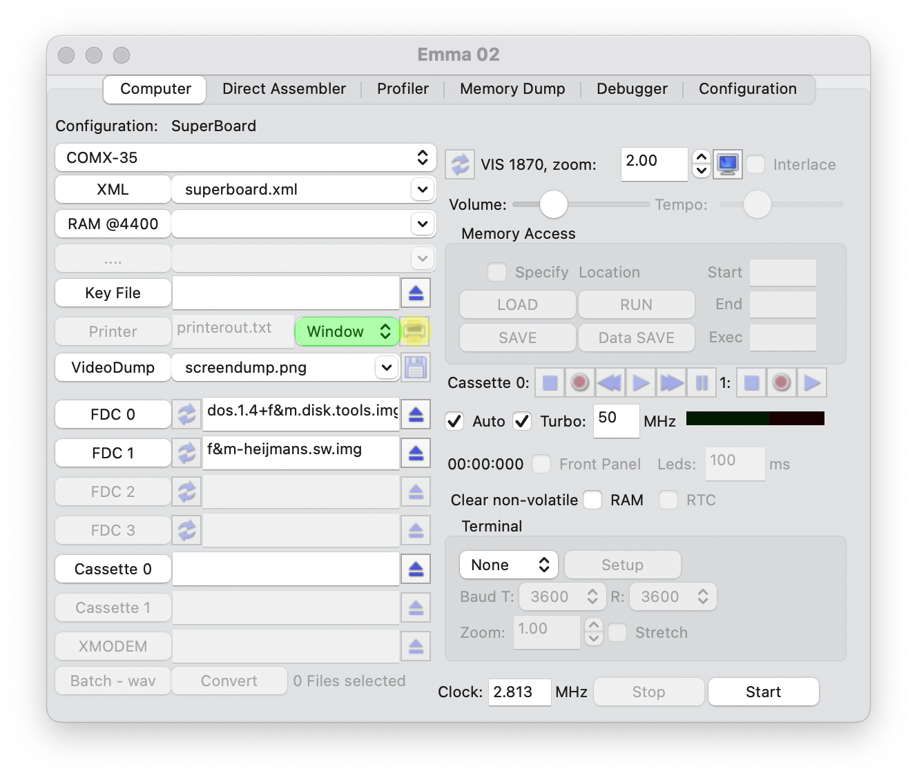 To run the COMX emulator with the Serial printer card select XML file fdc-serial-32k-eprom.xml.