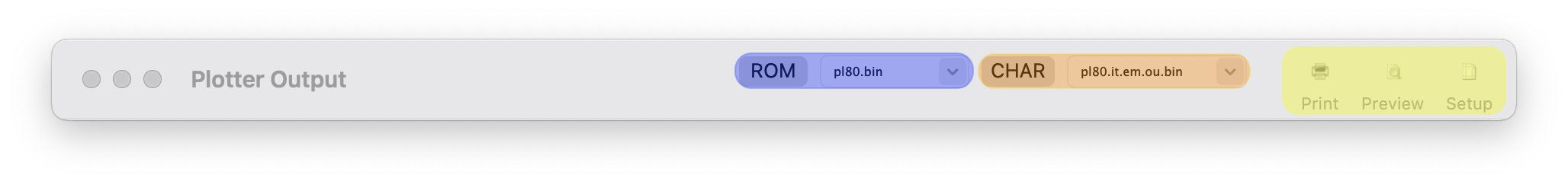 The plotter system ROM file can be changed via the ROM control (highlighted in orange) and the character ROM file via the CHAR control (highlighted in blue).