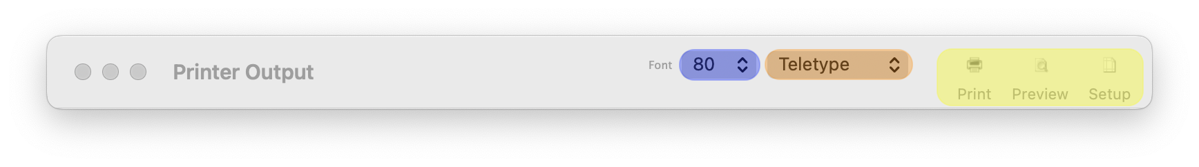 The printer font can be changed with the first 'Font' choice button (highlighted in blue). Default the teletype font is used which has a fixed width per line (like a matrix printer), all other fonts have a variable character width. The number of characters per line can be changed (40, 80, 96 or 120) with the second 'Font' choice button (highlighted in orange).