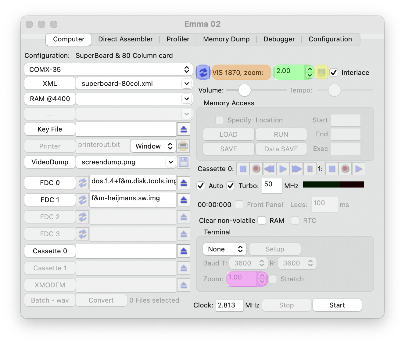 Default setting is 1 or 2 (depending on the emulated video type) where every actual dot of the emulated video screen is the same size (1) or twice the size (2) on the PC screen. The zoom level value can be specified from 0.5 and upwards (depending on PC screen size and resolution).