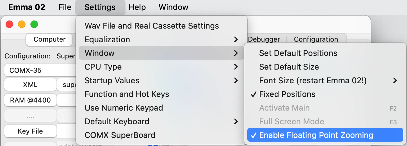Zooming is possible either with or without using a 'floating point' value. Default setting is using floating point values, this can be changed for all emulated computers via menu item below. A larger part of the screen or window will be used when using floating point values. Note, more PC processor load will be used, so if the screen emulation is too slow unselect the 'floating point' zooming.