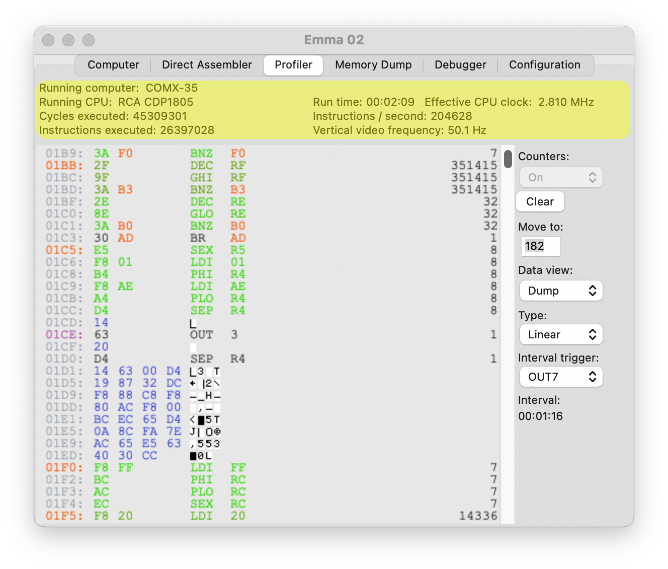 Before starting an emulator the profiler can be switched off with the 'Counters On/Off' selector. During run time the 'Counters Clear' button will reset all counters to 0.